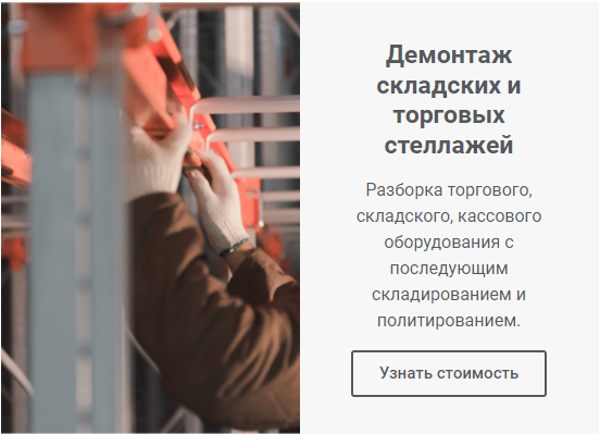 Команда профессионалов с богатым опытом в сфере услуг по монтажу, демонтажу складского и торгового оборудования, для пищевых и не пищевых товаров предоставляет свои услуги. А именно, стеллажей любой сложности для складских и торговых помещений, стеллажей для алкоголя и элитного алкоголя с подсветкой, хлебных, овощных горок, акционных корзин, кассовых боксов — всех видов, для магазинов, супермаркетов, АЗС, логистических и торговых центров — с выполнением работ «ПОД КЛЮЧ», на территории РБ, РФ и стран ближнего зарубежья.